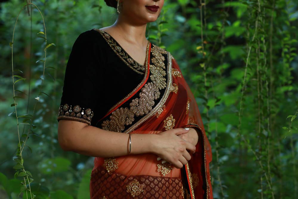 The colonial references – do you use French chiffon in your saris – are they hand-painted, or printed?
