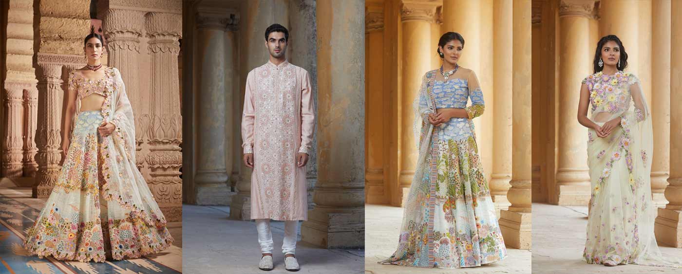 And return he did – to produce this set of floaty embroidered lehengas, gowns, saris, along with sherwanis and Nehru jackets for men. Just like the earth in one of James Lovelock’s quotes, that is “alive like a tree, using sunlight, water, and minerals to grow and change”, his collection has evolved quietly during the pandemic, reminding us of the power of quiet growth and tenacity. “The conversation between the tree and its surroundings found greater intimacy in the past months, as human intervention reduced,” says Rahul Mishra. “The virginal lotus ponds with life sprouting in diverse forms, the psychedelia of the underwater-scape, replete with striking hues and textures, and the symphony of birds and butterflies have inspired the craft behind ‘Lotus Pond’.”
