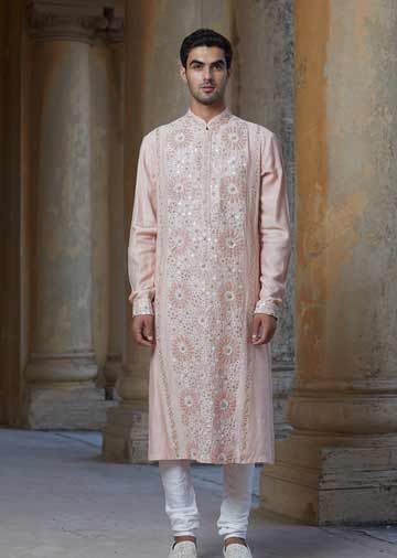 Delicate threadwork on a pale pink Nehru jacket by Rahul Mishra ICW2020 – FDCI