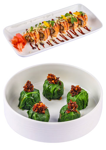 Dynamite and Rainbow Sushi, Prawn in XO Sauce, Yellow Curry Dimsums, Tuna Poke Bowl, Thai Basil Spiced Chicken.