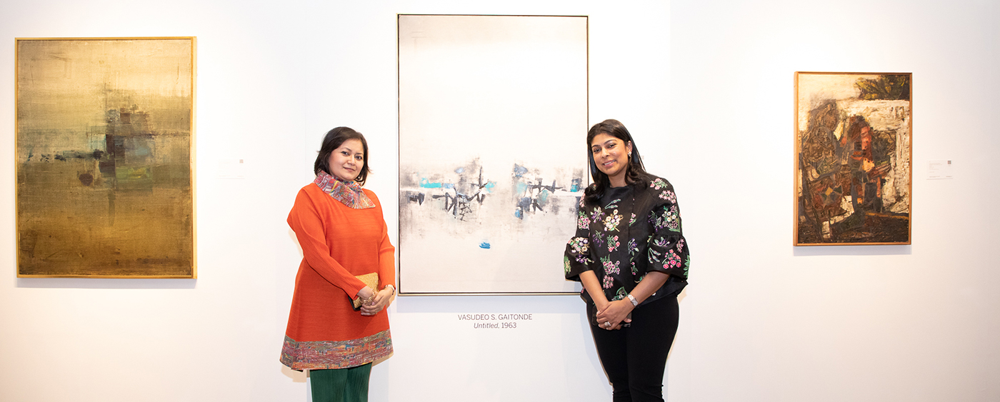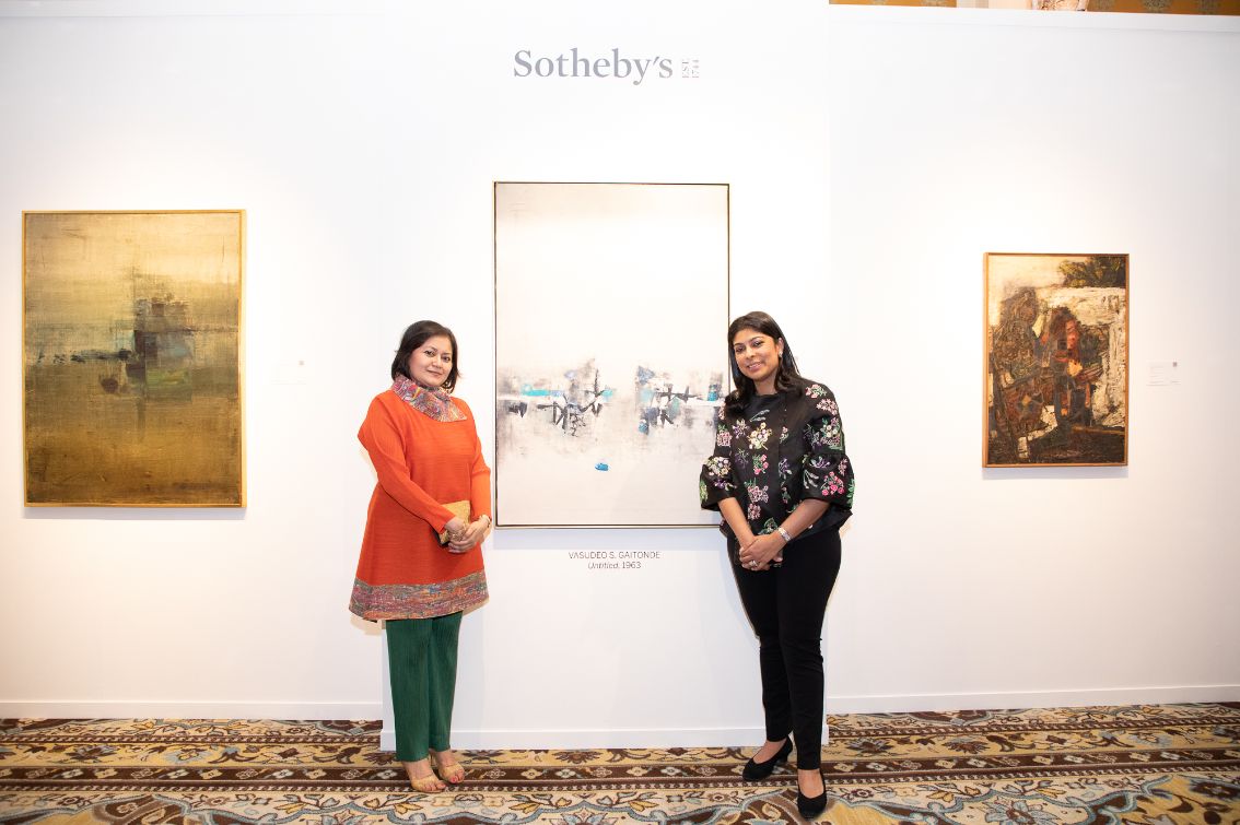 Anuradha Ghosh- Mazumdar, Head of Indian and Southeast Asian Art, Sotheby's New York and Manjari Sihare-Sutin, Head of Sale, Sotheby's New York against the Cover Highlights Wall