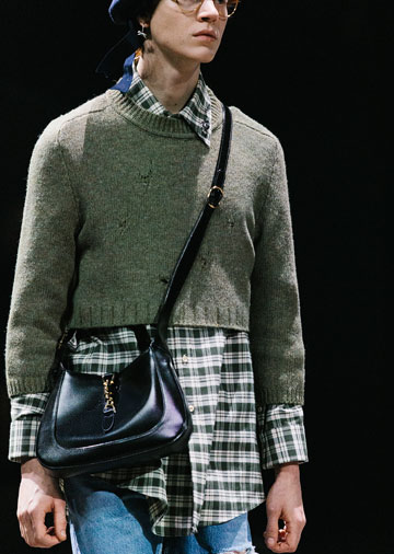 A key member of the Gucci bag family for many decades, the Jackie has been redesigned several times over the years. Its newest incarnation, designed by Creative Director Alessandro Michele, is the Jackie 1961. A fusion of his fascination with archival codes and contemporary vision, the bag reemerges to transcend traditional accessories classifications with its non-binary attitude. In fact, Alessandro Michele debuted the Jackie 1961 at HIS men’s Fall Winter 2020 fashion show.