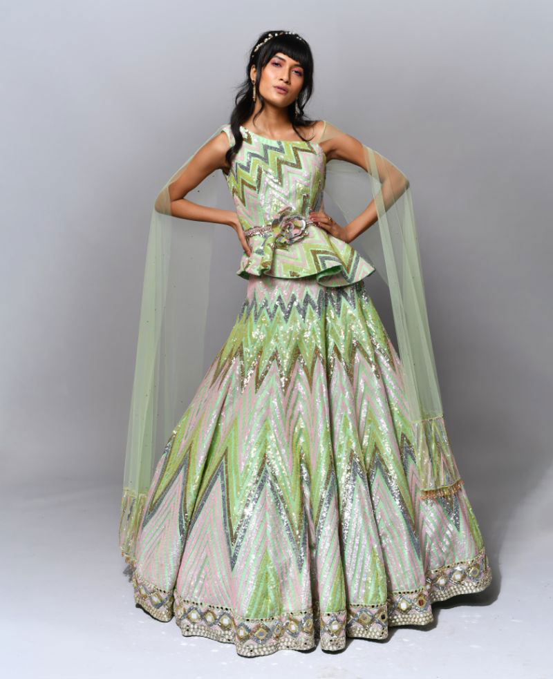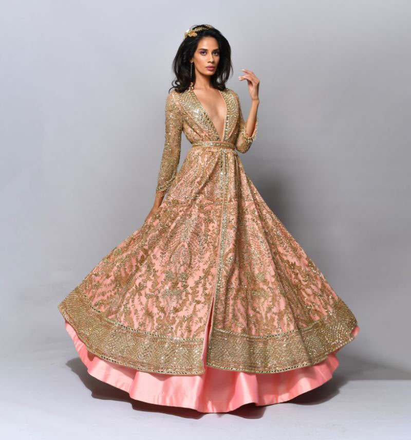 Model Sony Kaur sports a stunning V-neck jacket lehenga by Suneet Varma at ICW 2020 – FDCI