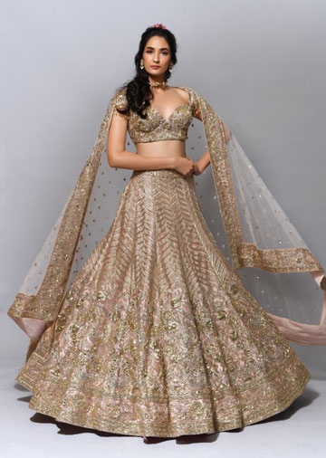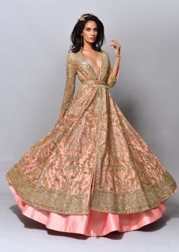 Since it is a digital showcase, everything has to be just right for this perfectionist. “The imagery that’s created, will last forever,” he says. “It’s up to you to portray your brand, the way you want.” And with Suneet, who’s known for his juxtapositions of embroidery, with crystals and sequins to create vivid, wearable tableaux, the eye registers the complexity of his creations as part of a grand, extravagant whole. His first section, entitled Bloom, is all about beautiful flowers and butterflies, corsages with dramatic shapes, and peplum tops. Then come a parade of spectacular lehengas with lots of zardozi, threadwork, and mirrorwork that literally glisten like a delicate waterfall, in shades of peach, coral, and shaded pink. In fact, the last lehenga, a shaded pink confection worn by model Sony Kaur even sports a dramatic train visible as one of the last frames of the show.
