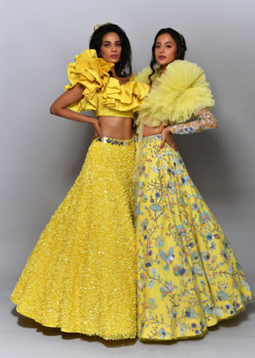 Dramatic flounce ruffled tops and sequined lehengas make a cheerful pairing in canary yellow by Suneet Varma at ICW 2020 – FDCI
