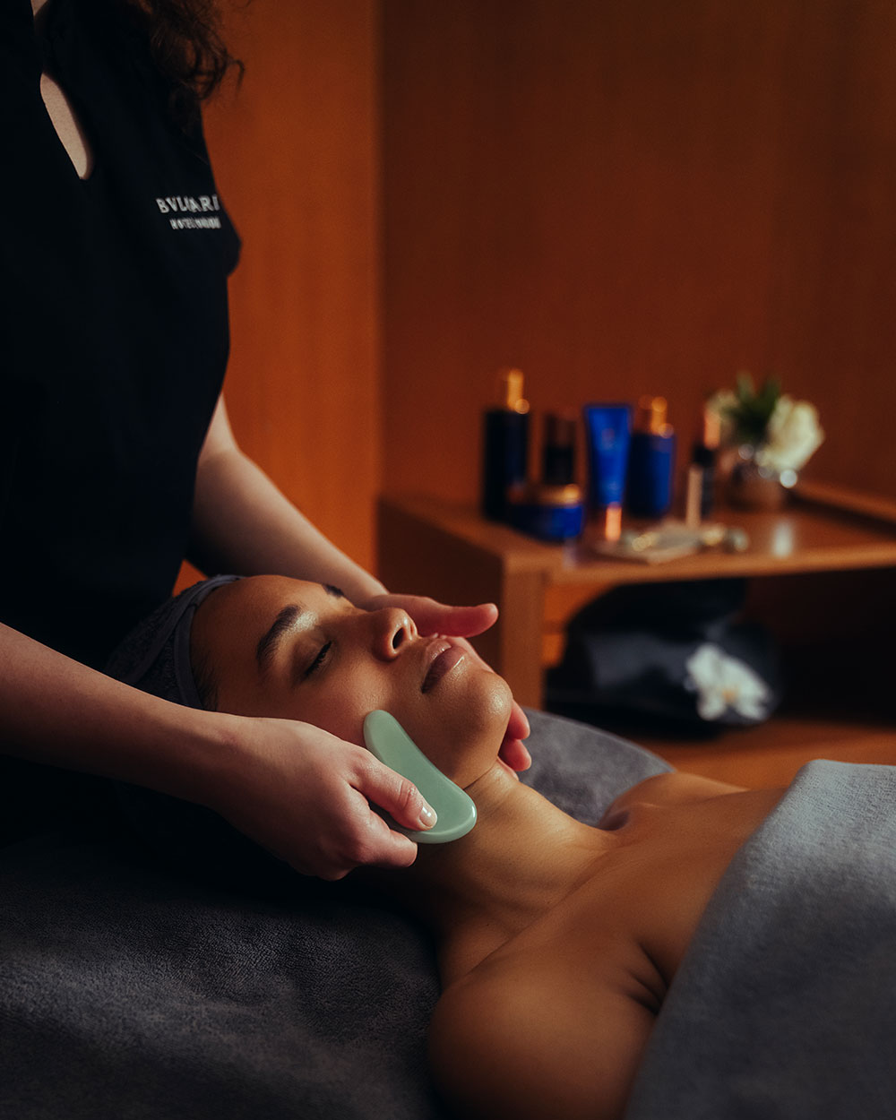 This facial is a bespoke 90-minute contouring and renewal treatment available only within the luxurious environs of The Bulgari Spa. It combines the innovation of Augustinus Bader’s science-backed skincare with the healing wisdom of the ancient Gua Sha technique, for a radiant, revitalized glow. The Jade Gua Sha tool, that the facial massage incorporates, is a balancing stone that symbolizes serenity and purity, while its green colour echoes the emerald mosaic, one of the iconic decorative elements of The Bulgari Spas.