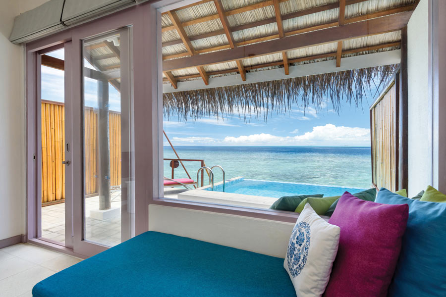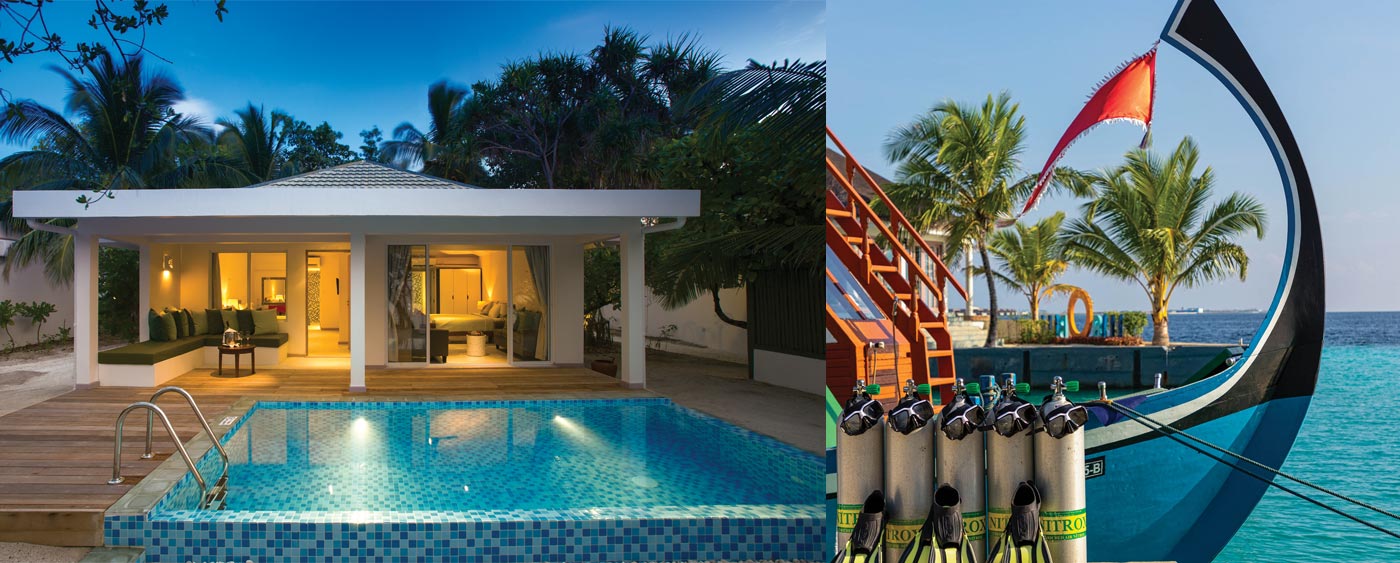 Vibrant, modern aesthetics, warm tropical colour accents, and cozy furnishings such as driftwood desks and starfish-shaped lights add to the tropical vibe. All beach villas come with beach essentials, amenities, and a mini bar. Experience high-quality world cuisine, at The Spice, the all-day dining for local Maldivian cuisine and international cuisine. Or head to the Hedhikaa Hut for delicious Maldivian deep-fried snacks. Or if you love seafood and meats, Just Grill is perfect, with its island setup and grilled delicacies. At Helen’s Bar and Pool, there’s a chic, bohemian vibe to either indulge in cocktails during the day on comfy sun loungers, or to end the day with bar nibbles, and sophisticated drinks and mocktails.