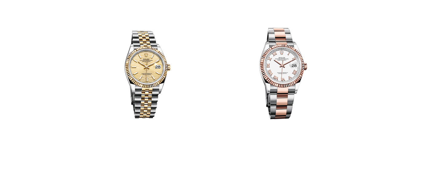 These design codes include the characteristic shape of its monobloc Oyster case, the 18 k gold (or Everose gold) fluted bezel, a golden, fluted motif dial (or white dial), the Cyclops lens over the date and the five-piece link Jubilee bracelet (with a folding Oysterclasp), which has become a classic – particularly in the yellow Rolesor version, combining links in steel and links in 18 k yellow gold. The Everose version comes with an Oyster bracelet – flat, three-piece links in Everose Rolesor (a combination of Oystersteel and 18 k Everose gold).