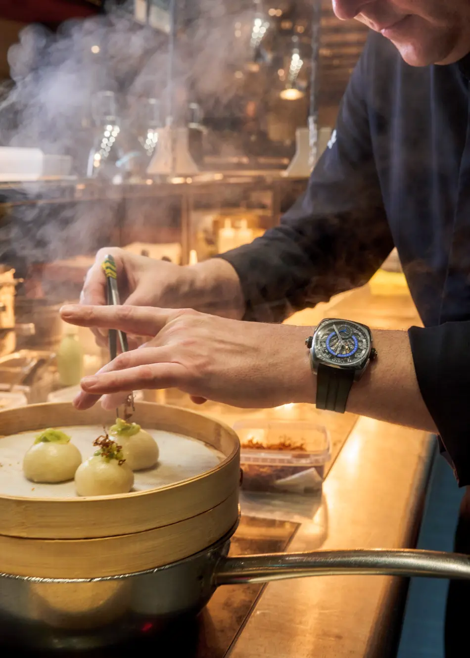 “It is a privilege for me to have discovered the Cyrus Genève universe and I feel perfectly at ease with my Klepcys GMT Retrograde,” says Chef Stefan Heilmann. “Practical, functional and comfortable on the wrist, it accurately marks my time in the kitchen. Time that is precious for artfully prepared dishes. Haute cuisine and high-end watchmaking are two arts that come together to create different but unique experiences that I guess we can promote together.”
