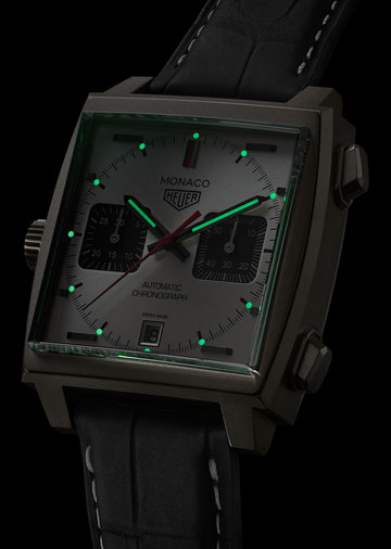 The markers and indices of the TAG Heuer Monaco Titan Special Edition are visible in any conditions