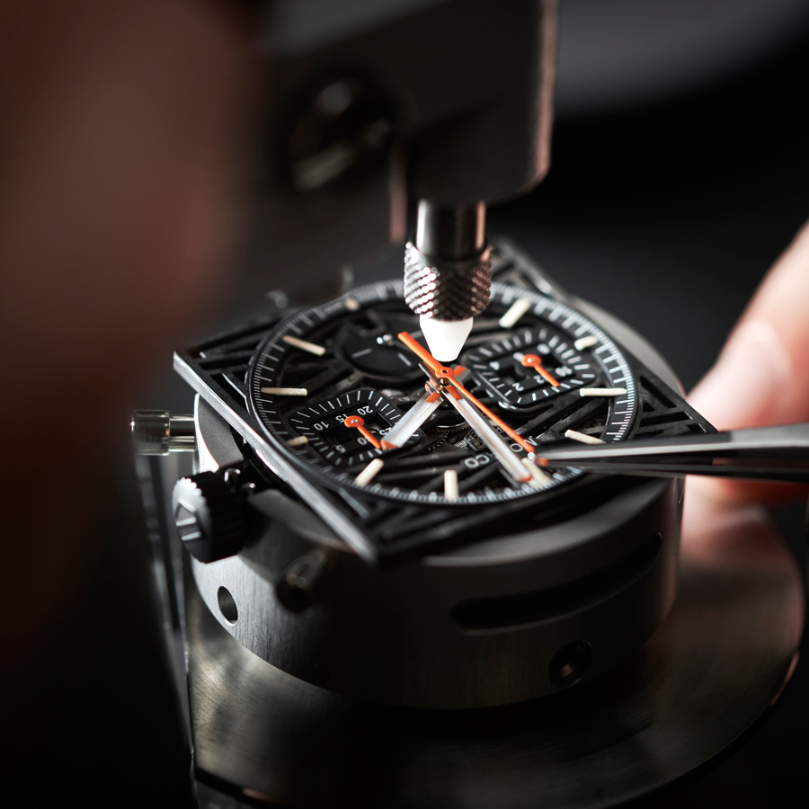 Applying the hour hands on TAG Heuer's Carbon Monaco