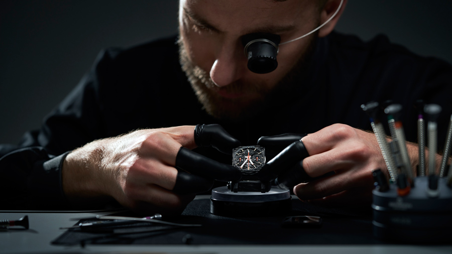Skilled watchmakers at La-Chaud-de-Fonds headquarters of TAG Heuer work on the Carbon Monaco