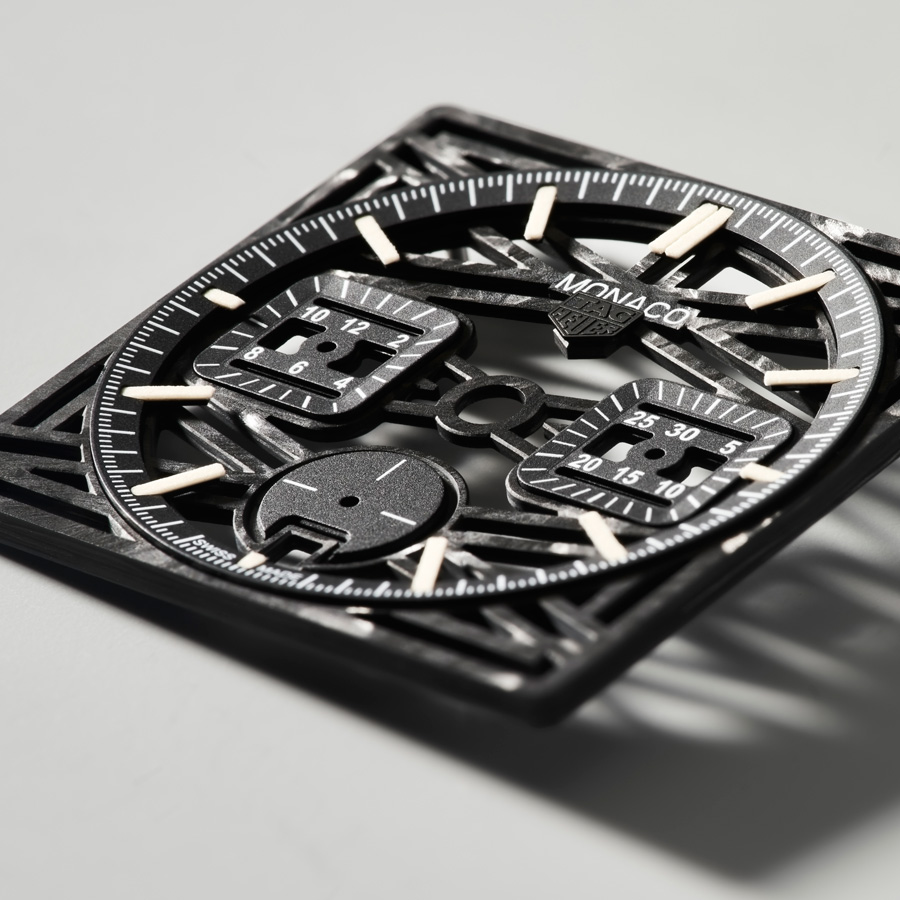 The striking skeletonized dial that gives the watch so much of its character is also carbon. It was created in collaboration with TAG Heuer’s long-time partner, dial specialists ArteCad, and is worked from a single piece of carbon fibre. The dial’s architectural look was created by milling and drilling the basic form to reveal striking structural shapes that stretch across the face of the watch like struts on a racing car, a design that makes a subtle reference to TAG Heuer’s roots in motor sport.