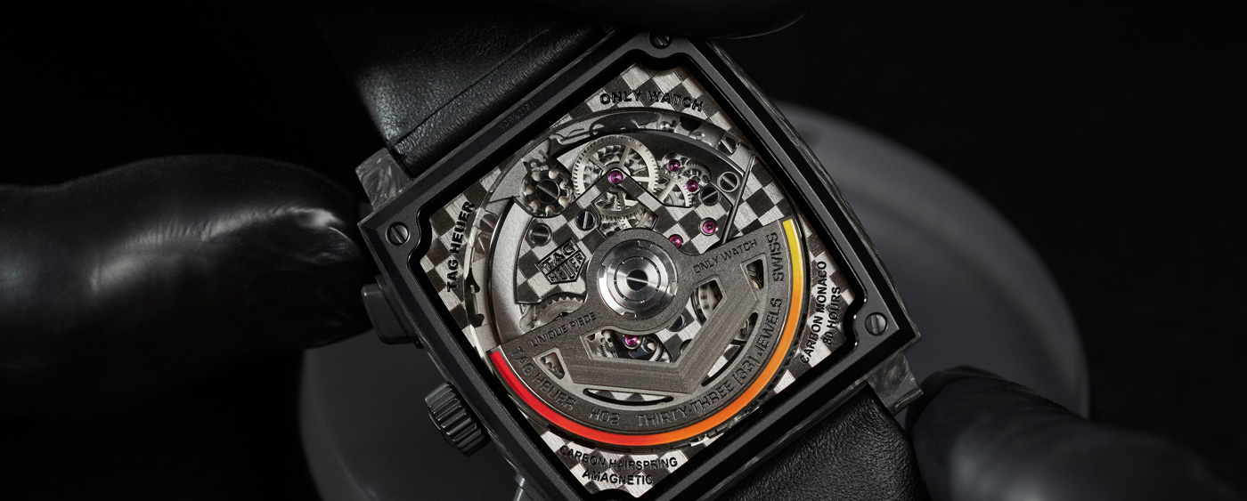 The TAG Heuer Only Watch Carbon Monaco is powered by TAG Heuer’s in-house Heuer 02 automatic chronograph, a Swiss-made movement with an 80-hour power reserve. This is a unique expression of the Heuer 02, created exclusively for the occasion. Not only has the movement been beautifully decorated by hand, it also carries TAG Heuer’s groundbreaking in-house carbon hairspring, developed by the company’s TAG Heuer Institute, which delivers exceptional anti-magnetism, shock resistance, stability across temperature ranges and refined geometry for excellent chronometric performance.